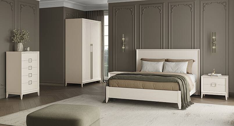 Особое внимание уделено кровати с высокой головной спинкой, декорированной фактурной тканью с 3D-эффектом.