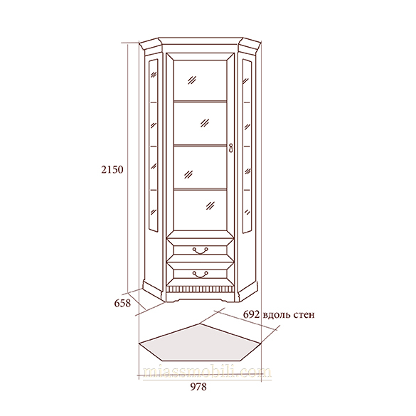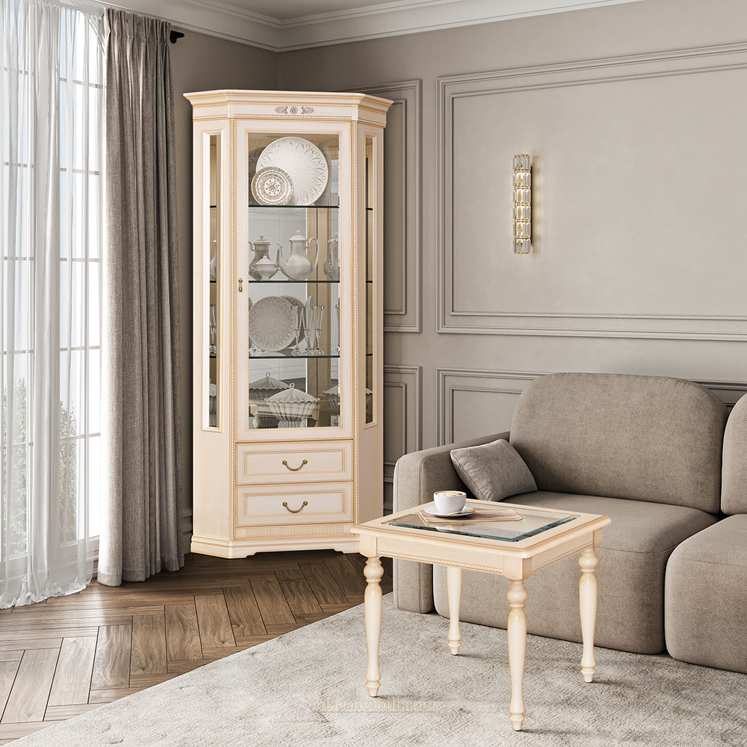 Фасад витрины декорирован накладными элементами. Высококачественная фурнитура обеспечивает долгий срок эксплуатации.