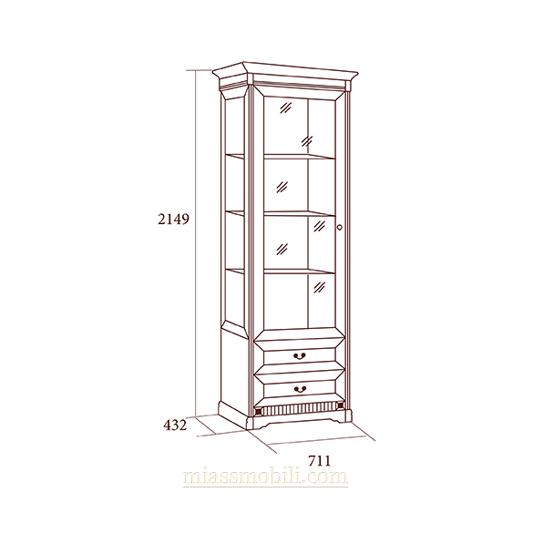Фасад витрины декорирован накладными элементами. Высококачественная фурнитура обеспечивает долгий срок службы.